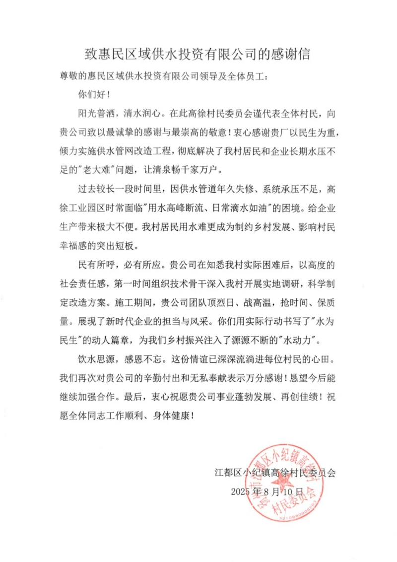 高徐村民委員會在感謝信中寫道:“施工期間,貴公司團隊頂烈日、戰高溫,搶時間、保質量。展現了新時代企業的擔當與風采。你們用實際行動書寫了水為民生的動人篇章,為我們鄉村振興注入了源源不斷的水動力。”